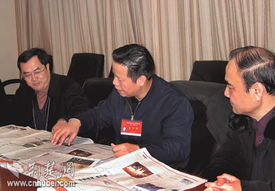 張昌爾說(shuō),各新聞單位高度重視“兩會(huì)”報(bào)道,會(huì)前充分準(zhǔn)備,作了周詳計(jì)劃。會(huì)中派出精兵強(qiáng)將,全力以赴。報(bào)紙、電視、廣播的報(bào)道各自亮點(diǎn)頻出,手法多樣,可讀性可視性可聽(tīng)性大大增強(qiáng),較好地反映了代表委員參政議政的風(fēng)采。他希望參加“兩會(huì)”報(bào)道的新聞工作者繼續(xù)努力,更多地關(guān)注基層代表委員的聲音,報(bào)道他們?cè)谏鐣?huì)主義民主制度建設(shè)中發(fā)揮的作用,為重大政治性戰(zhàn)役報(bào)道落實(shí)“三貼近”原則積極探索。圖為張昌爾在評(píng)點(diǎn)湖北日?qǐng)?bào)“兩會(huì)在線”。