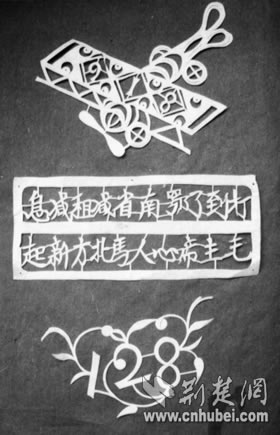 中國剪紙起源于裝飾藝術(shù)。樣式有窗花、燈花、喜花以及鞋墊花等。其中用來制作繡花底樣的雕花剪紙又名“花樣”,主要是供婦女刺繡使用的圖案底稿,大多是與民眾日常生活關(guān)系密切的傳統(tǒng)圖案。此次發(fā)現(xiàn)反映抗戰(zhàn)主題的50多張花樣剪紙,從構(gòu)圖、技法上看,比較稚嫩、粗糙,但充分體現(xiàn)了藝人們的創(chuàng)新精神。其中最顯眼的是一張邊緣殘缺、破舊的黃裱紙,上面依稀可見“兒童團(tuán)”三個(gè)字,是唯一的一張剪紙?jiān)濉H~家慶介紹,寫著“打到了鄂南省減租減息,毛主席心(新)人馬北方新起”(如左圖)的花樣,從內(nèi)容分析,反映了1944年新四軍各軍區(qū)對(duì)日偽軍發(fā)動(dòng)春夏秋季攻勢(shì),并粉碎日偽軍反撲,解放國土、人口,改善華中各抗日根據(jù)地的斗爭形勢(shì)。