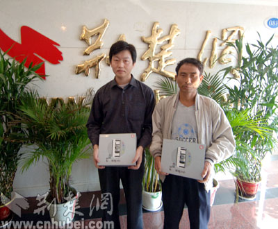 荊楚網(wǎng)24日訊 記者艾丹 潘頔 報道:23日抽出的“讀報紙、發(fā)短信、中手機”活動的兩位幸運獲獎者,武漢的李先生和谷城的孟先生,今天下午來到荊楚網(wǎng)領獎,荊楚網(wǎng)總編輯閻思甜親自為他們頒獎。