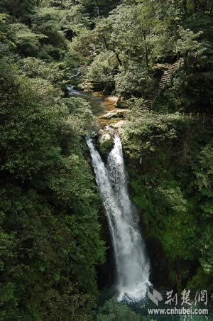 參觀完兩處紅色旅游景點之后,記者們順道觀光了龍?zhí)讹L景區(qū)。龍?zhí)段挥诖钠何鞅逼吖,是近年來開發(fā)的以自然與人文景觀相結(jié)合的旅游風景區(qū)。據(jù)介紹,當?shù)氐奈迳窈邮驱執(zhí)丁拔逄妒似佟钡脑慈O疀_擊小井峽谷后,陡然跌落絕壁之下,又連續(xù)飛下四級斷崖,形成梯狀的五個氣勢磅礴的瀑布和深潭,這就是碧玉、金鎖、珍珠、飛鳳、玉女等五潭五瀑。細察五潭,碧水泱泱,樹影幢幢,崖壁如刀削斧鑿,崖腳怪石,汀芷競秀,綠蔭覆蓋四周。仰觀五瀑,潭潭無俗水,瀑瀑似神女。