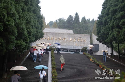 進門后,展現(xiàn)在人們眼前的是109級臺階,威嚴肅穆的紀念堂就矗立在山頂上。導游小姐告訴記者,這些臺階分為兩組,第一組49級,象征1949年新中國成立。第二組60級,寓意陵園是在井岡山革命根據(jù)地創(chuàng)建六十周年的1987年建成。