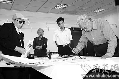 九九重陽節(jié),武漢市老年書畫研究會的20多位老書畫家,應邀參加“紀念抗戰(zhàn)勝利六十周年書畫筆會”。圖為原解放軍總后武漢基地指揮部中將司令員、武漢市老年書畫研究會名譽會長張書坤奮筆作書“勿忘國恥,不辱使命”八個遒勁有力的大字。