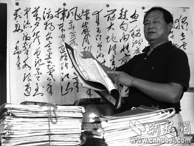 近日,記者采訪了被稱作“湖北毛體書法第一人”的宋明政先生,見到幾可亂真的毛體書法(如圖),還有用禿的千余支毛筆。
