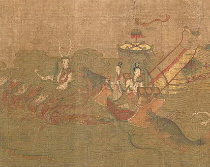 此圖是根據(jù)三國(220--265年)魏人曹植所寫《洛神賦》而創(chuàng)作的故事畫。畫面開首描繪曹植在洛水河邊與洛水女神瞬間相逢的情景,曹植步履趨前,遠(yuǎn)望龍鴻飛舞,一位“肩若削成,腰如約素”、“云髻峨峨,修眉聯(lián)娟”的洛水女神飄飄而來,而又時隱時現(xiàn),忽往忽來。后段畫洛神駕六龍云車離去,玉鸞、文魚、鯨鯢等相伴左右,洛神回首張望,依依不舍,一種無奈離析之情顯現(xiàn)畫面。