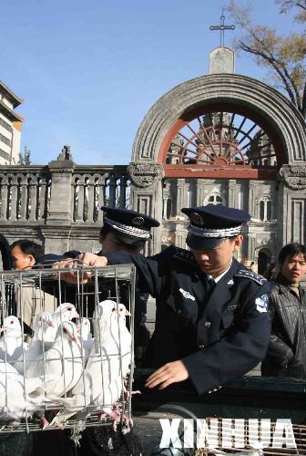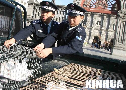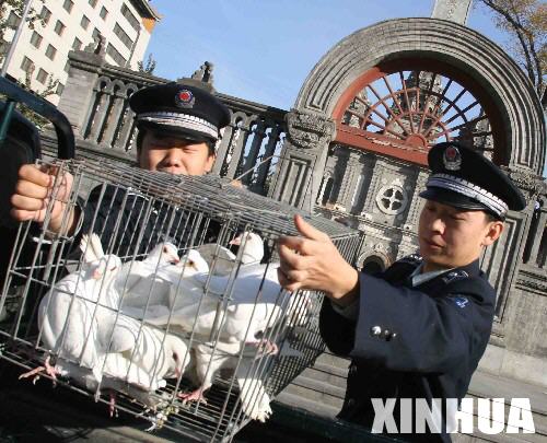 11月15日,北京市東城區(qū)城管隊(duì)員在王府井教堂的廣場前拉起一張捕鳥網(wǎng),捕捉廣場附近的野鴿子。這些野鴿子將被送到信鴿協(xié)會(huì)在昌平設(shè)立的鴿舍,待禽流感疫情解除后,再放回廣場。 新華社發(fā)(吳強(qiáng) 攝)