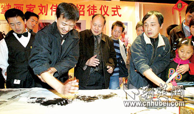 12點,比拼結(jié)束,張俁俁、萬正濤、武大學(xué)生張艷平等10人順利地成為劉偉新的入室弟子!八麄兡贻p、書畫功底扎實,看來我的掌畫將后繼有人!眲バ乱荒樞σ狻