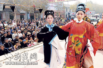 昨日,我省武市花橋鎮(zhèn)居民在大街上觀看當(dāng)?shù)孛耖g劇團(tuán)演出的黃梅戲。當(dāng)天,武市震后生活基本恢復(fù)正常,中小學(xué)校也將正常上課。新華社發(fā)