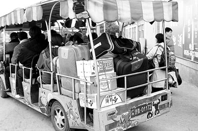 7日,幾名農(nóng)民工乘坐煙臺火車站的免費(fèi)電瓶車進(jìn)站。據(jù)介紹,從2005年12月24日開始,煙臺火車站為返鄉(xiāng)的農(nóng)民工開辟了“綠色通道”,為傷殘或行李較多的農(nóng)民工排憂解難。(新華社發(fā))