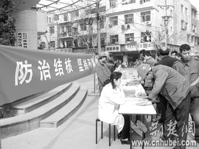 荊楚網(wǎng)(楚天都市報)(記者 盧水平 通訊員 夏瓊 項征國 攝)昨日是世界防治結核病日,江漢區(qū)疾控中心為附近幾個建筑工地的280名農(nóng)民工,進行免費結核病透視篩查,結果發(fā)現(xiàn)5例可疑肺結核病人。據(jù)介紹,進城務工者及流動人口肺結核病患病率,高出市內常住人口一倍,是目前城市結核病的重要傳染源。