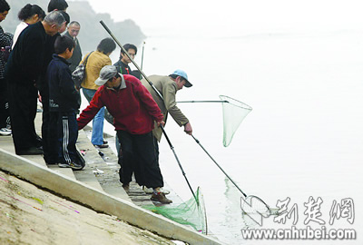 荊楚網(wǎng)(楚天都市報)記者陳曙光 葉茂林 實習(xí)生 楊子鈺 王高偉:昨日上午,一群市民來到長江一橋下武昌江灘,將一批小魚放生,很快便有人在放生處捕撈。