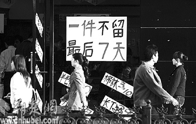 昨日,武漢市江漢路某品牌商店用碩大的“褲”字吸引行人購買欲(圖一)。在市場競爭激烈的今天,“臉面”設(shè)計(jì)成為商家費(fèi)勁腦筋追逐的重心,但也有一些商家長期打著“大甩賣”的旗號(hào)欺騙消費(fèi)者,頗煞風(fēng)景(圖二)。記者 張鴻 攝