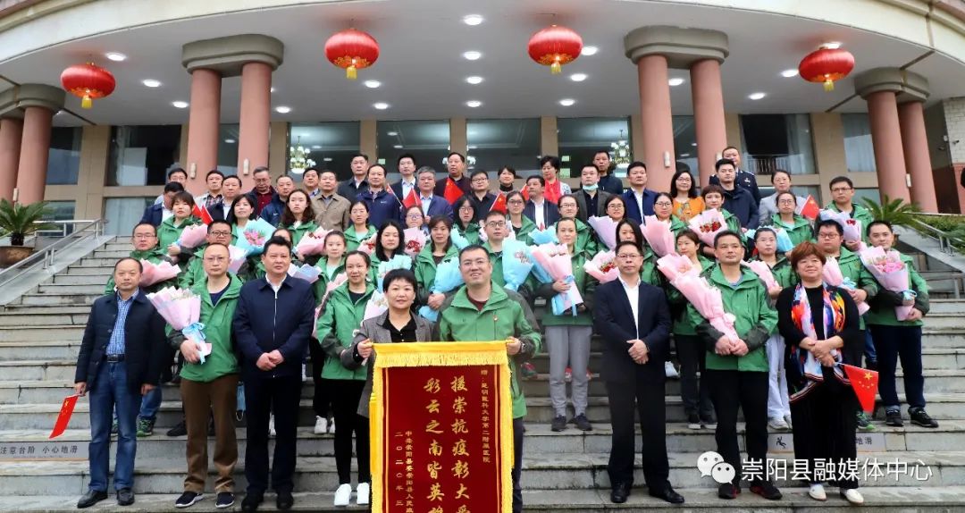 送別儀式上,杭鶯、鄭俊華等縣領(lǐng)導(dǎo)為全體云南醫(yī)療隊隊員獻(xiàn)上鮮花。隨后,杭鶯向云南醫(yī)療隊隊長董昭興頒授印有“援崇抗疫彰大愛 彩云之南皆英雄”錦旗并合影留念。