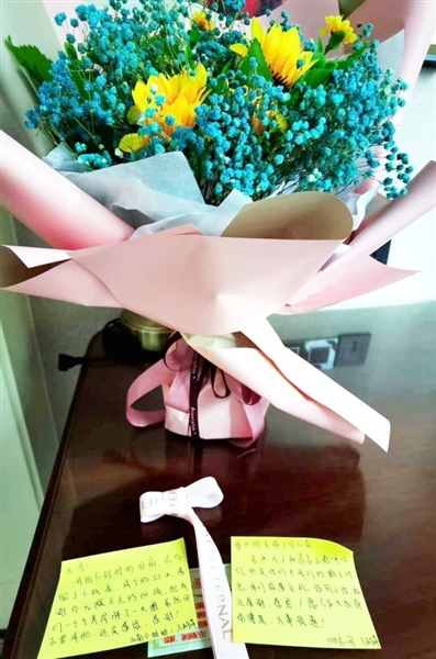 自稱為“云南小姐姐”的萬麗萍,將一束開得正艷的花和兩張小紙條擺在桌上。“玉哥,我怕分別時的淚崩,給你留了小紙條。咸寧的55天,感謝你無微不至的照顧,把我們一個個養(yǎng)得胖了一大圈。雖然回去要減肥,還是感恩、感謝!”