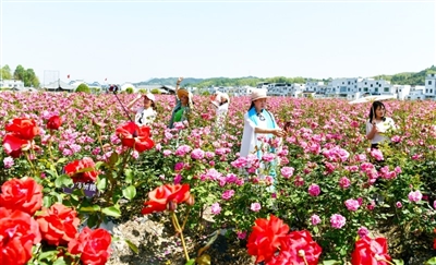 通城縣麥?zhǔn)墟?zhèn)冷段村引進(jìn)資金,在200余畝荒地上種植月季花。20多個(gè)品種的月季正值盛花期,每天吸引眾多游客游玩賞花,當(dāng)?shù)匕才?0多位農(nóng)民配套服務(wù),在家門口增收。