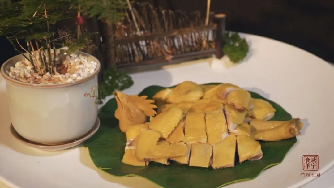 本菜以一歲之內(nèi)竹林走地仔雞為主料,做成白切雞。菜名以劉伶酒后漫步,灑脫不羈,山行之中,聞得雞鳴聲的山居之趣而得其意。