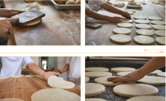 做好一批麻餅坯子,灑上些許面粉,搬移到竹匾中,在這里進(jìn)行兩面著麻的工序,幾個(gè)來回?fù)u移翻面間,芝麻均勻附著在面餅上,煞是好看了。