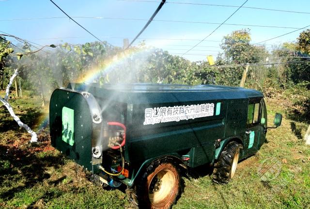“一輛植保車輕輕松松一小時(shí)噴灑作業(yè)可以達(dá)到25畝以上,這是人工一天‘拉了瓦’也到達(dá)不了的的作業(yè)量?!?1月12日,在神山興農(nóng)公司位于官塘驛鎮(zhèn)御屏山村的半島獼猴桃基地,熊堃坐進(jìn)1.5米身高的袖珍新能源植保車,拉動(dòng)手閘,轉(zhuǎn)動(dòng)方向盤,一番操作后,通過7條噴孔噴出的霧狀藥液在陽光下形成一道彩虹。