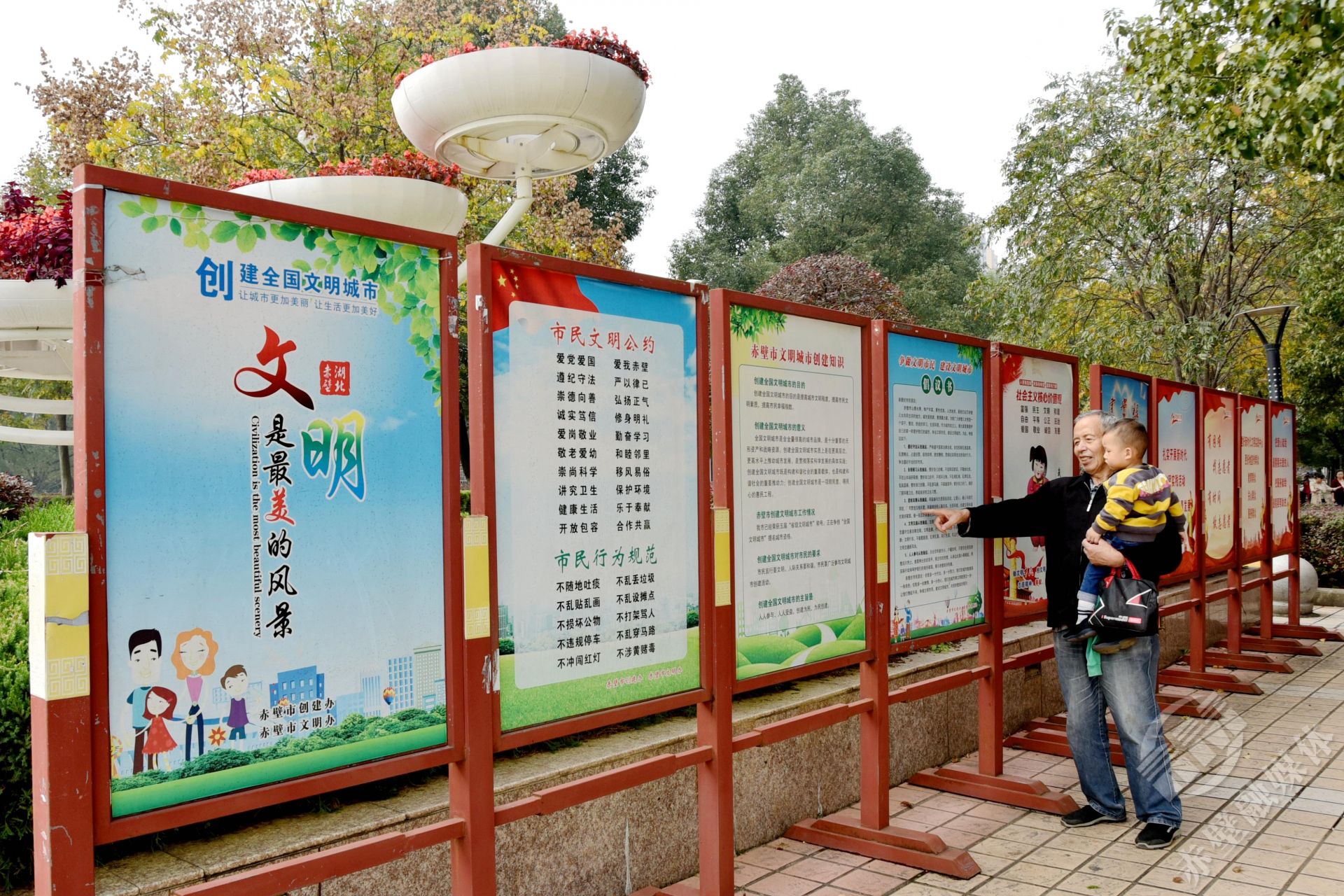 “今天帶孫子出來轉(zhuǎn)轉(zhuǎn),抬眼就看到這個,正好教孫子認(rèn)認(rèn)字。”10月29日,溜彎在人民廣場的羅爺爺指著文明創(chuàng)建宣傳展板開心的對記者說。