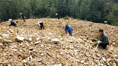 2月17日(大年初六)上午,春風(fēng)輕拂,暖陽高照,年味正濃,在青山疊翠的汀泗橋鎮(zhèn)古田村十四組背底窩的一個(gè)小山坡上,傳來一片歡笑聲和鋤地聲,40余名村民正在忙著栽種杉樹苗。