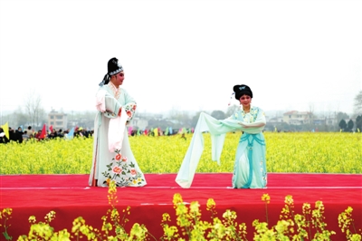 精彩的文藝演出、極具地方風(fēng)情的民俗表演和國家非物質(zhì)文化遺產(chǎn)提琴戲演唱,與花海交相輝映,為大家?guī)砹艘暵犑⒀纭i_幕后,游客開始游玩賞景,大家邊感嘆七彩油菜花的美,邊呼朋引伴拍照留念,人花相映襯,美不勝收。除了賞花,大家還紛紛品嘗特色美食,購買當(dāng)?shù)靥厣r(nóng)產(chǎn)品。