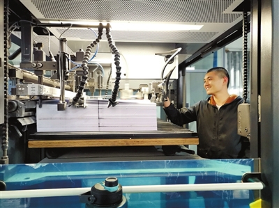 3月3日,記者在山河文化發(fā)展有限公司看到,車間里機(jī)聲隆隆。在一個(gè)大型流水機(jī)器旁,一名員工專注地放紙,隨后機(jī)械打印、切割、檢驗(yàn)、裝訂成書……人機(jī)配合十分默契。
