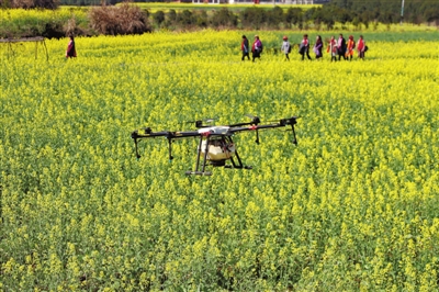3月4日,在咸安區(qū)馬橋鎮(zhèn)建國畈油菜花海,一臺無人機盤旋在油菜花田上方,為油菜噴施環(huán)保復合肥。據(jù)咸安區(qū)農(nóng)業(yè)農(nóng)村局介紹,這是通過無人機來給油菜送“套餐”,無人機攜帶著精心調(diào)配的藥肥,能夠快速的對油菜大面積噴灑覆蓋,作業(yè)效率和效果顯著優(yōu)于人工噴施。