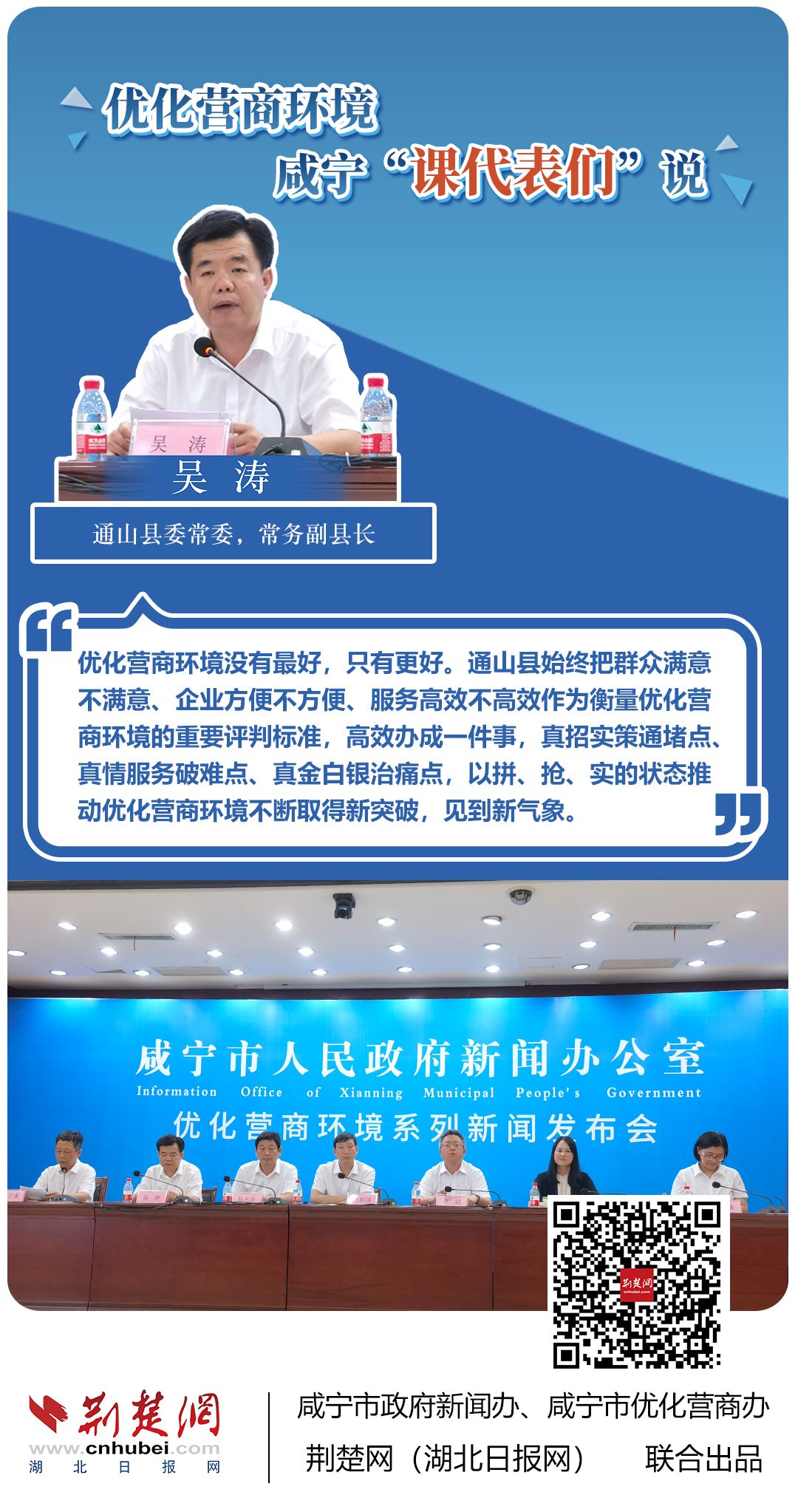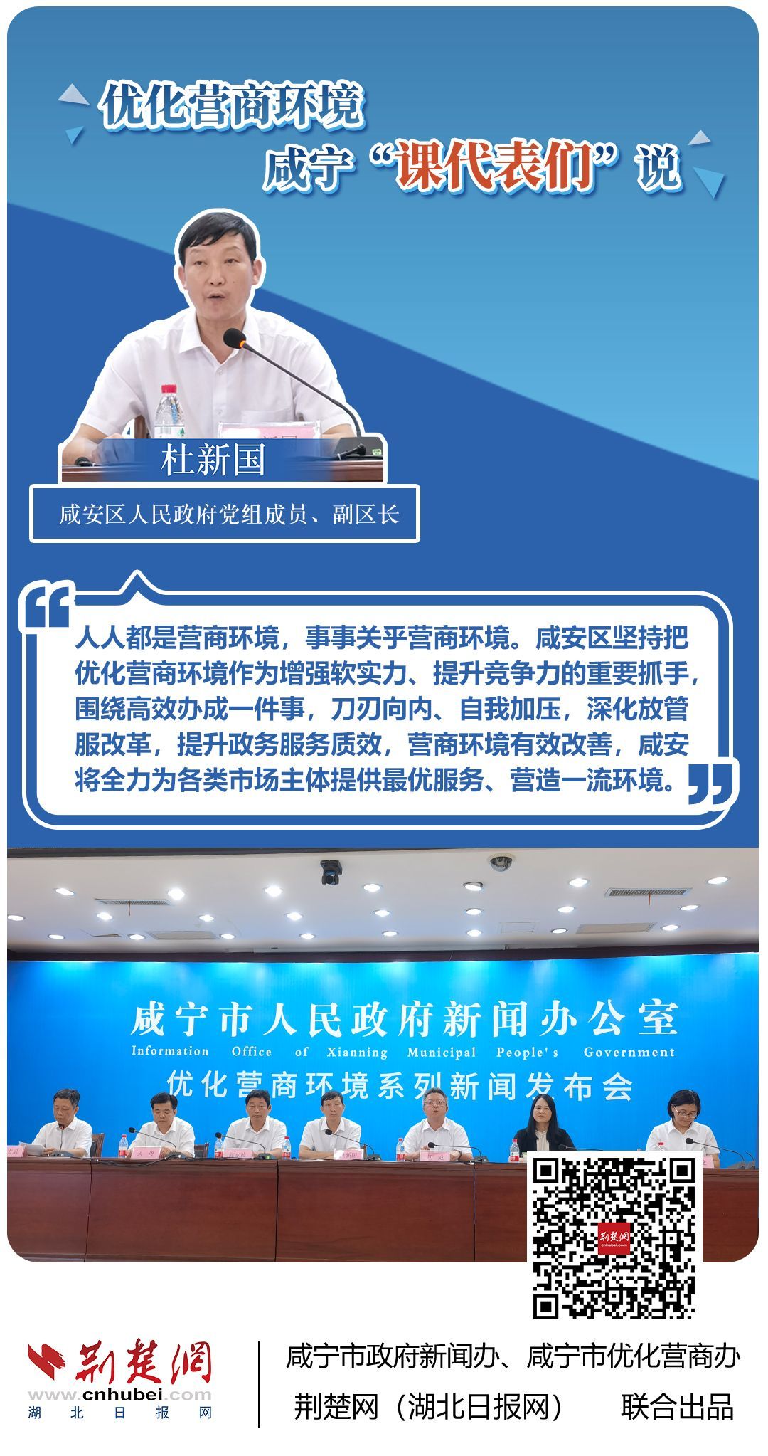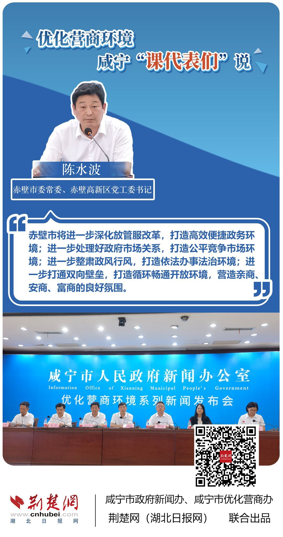 荊楚網(wǎng)(湖北日?qǐng)?bào)網(wǎng))訊(記者 田城 通訊員 孫方成 張永紅)跨省通辦、“零干擾環(huán)境”、最簡(jiǎn)流程優(yōu)服務(wù)、深化“放管服”改革、整肅行風(fēng)政風(fēng)……7月20日下午,咸寧市召開(kāi)優(yōu)化營(yíng)商環(huán)境新聞發(fā)布會(huì)。會(huì)上,咸安區(qū)、嘉魚(yú)縣、赤壁市、通城縣、崇陽(yáng)縣、通山縣6個(gè)縣市區(qū)優(yōu)化營(yíng)商環(huán)境發(fā)言人亮相,全面介紹當(dāng)?shù)貎?yōu)化營(yíng)商環(huán)境有關(guān)情況,持續(xù)推進(jìn)咸寧市營(yíng)商環(huán)境朝著更優(yōu)、更好方向前進(jìn)。