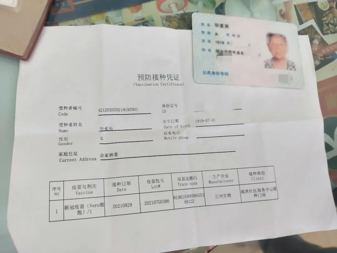 8月29日,居住在咸安區(qū)溫泉街道桂花路社區(qū)的百歲老人畢麥英,在溫泉衛(wèi)生服務(wù)中心新冠疫苗接種點(diǎn)接種第一劑次新冠疫苗,她是咸寧市目前最年長(zhǎng)的新冠疫苗接種者。