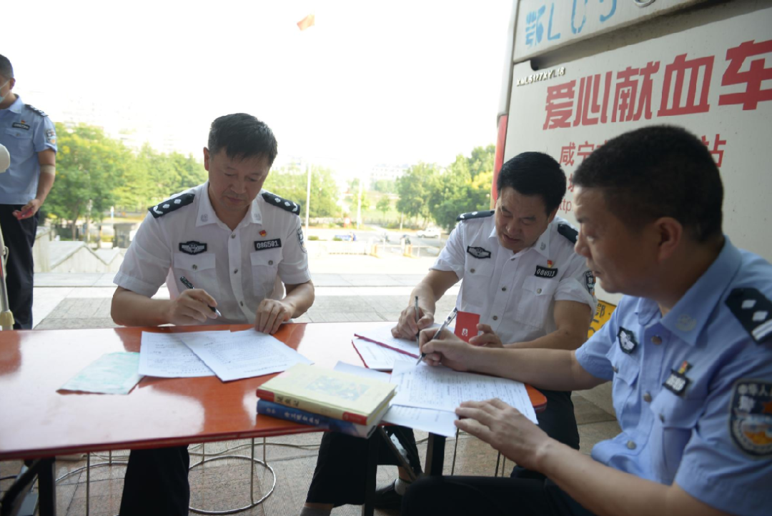 在咸寧公安主樓門廊中,聞訊趕來的民輔警整齊列隊,按照醫(yī)務(wù)人員的指引,依次進(jìn)行信息登記、血液檢查、靜脈采血。有多次參加獻(xiàn)血的“金獎老將”,也有初次上陣的“警營新兵”,還有尚在見習(xí)期的“學(xué)警新秀”。心照不宣的接力,在新老交織中流淌、賡續(xù)、傳承,匯聚起愛的暖流!