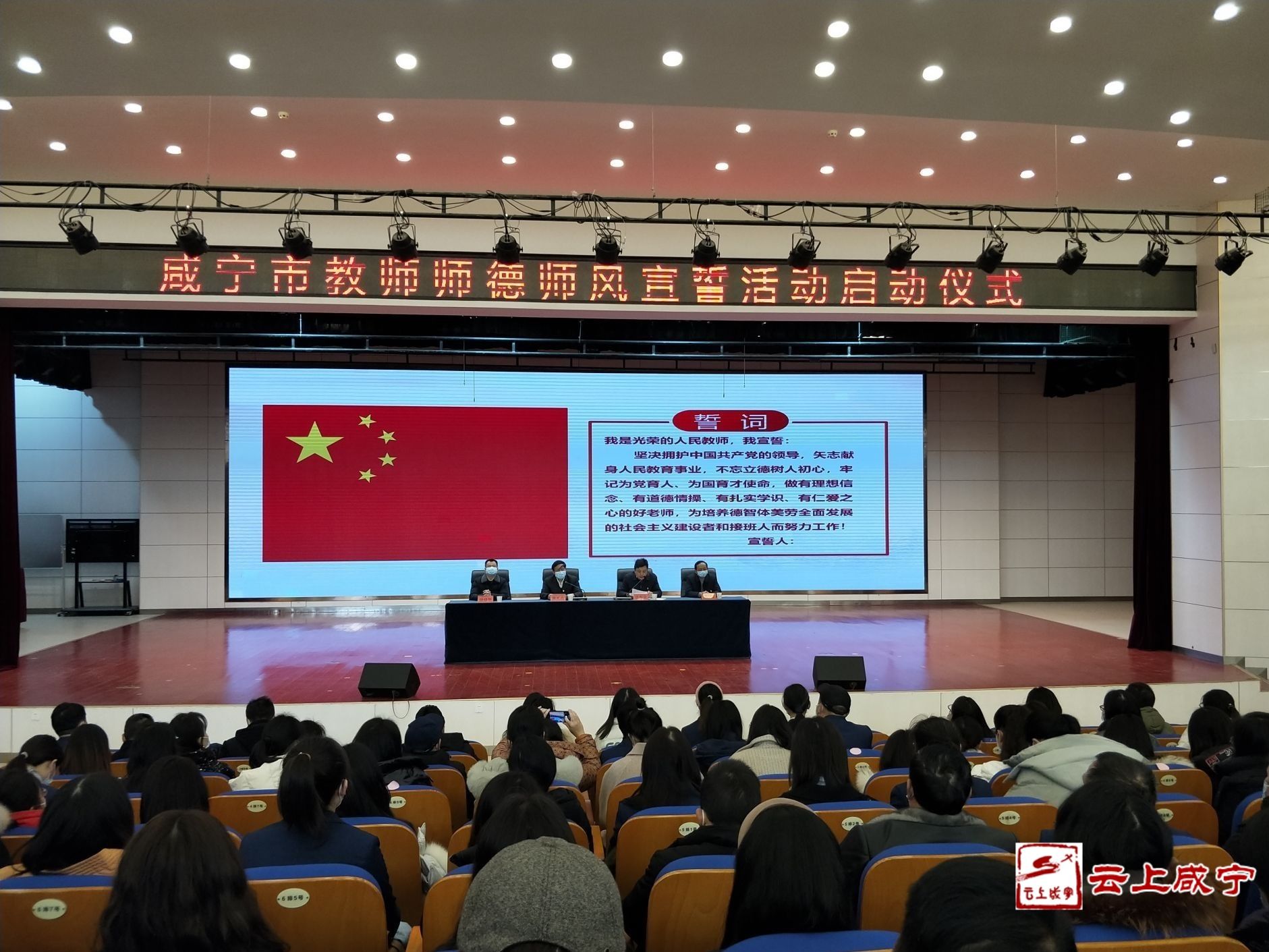 “我是光榮的人民教師,我宣誓……”1月19日上午,啟動儀式在市實驗小學(xué)報告廳舉行,咸寧市溫泉中學(xué)、咸寧市實驗小學(xué)所有在職教師面向國旗、莊嚴(yán)宣誓:牢記為黨育人、為國育才使命,做“四有”好老師。
