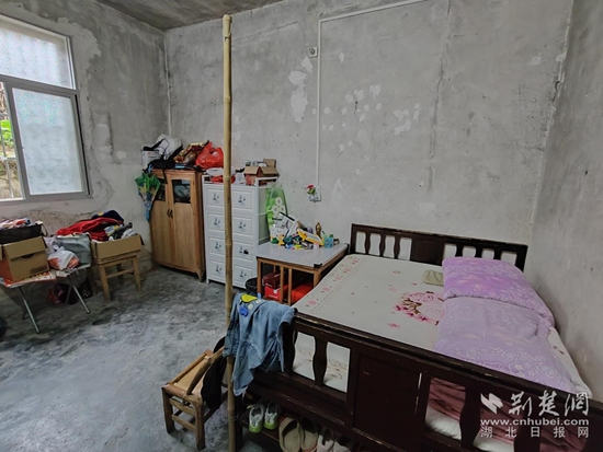 一張簡(jiǎn)陋的木床、一個(gè)簡(jiǎn)易拼裝的衣柜、一個(gè)老舊的木柜,就是胡新苗的房間。