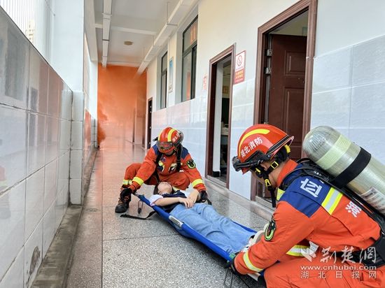伴隨著陣陣緊促的警笛聲在校園響起,一教室內(nèi)“電線短路”,引燃桌面書籍,頓時濃煙滾滾?!罢埜魑煌瑢W不要驚慌,捂住口鼻、低頭彎腰、貼墻往樓下有效進行疏散......”廣播中傳來疏散指令,消防員指導全體師生從“安全出口”有序迅速撤離,通過體驗“生命通道”,使師生掌握火場疏散逃生技能。