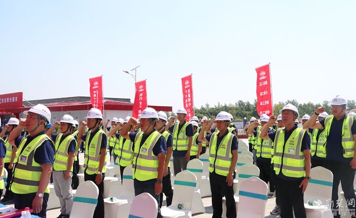 “我是一名光榮的建設(shè)者,面對鮮紅旗幟,莊嚴(yán)宣誓: 快速制勝,安全至上,只爭朝夕創(chuàng)高產(chǎn);精細(xì)管理 創(chuàng)譽創(chuàng)效,銳意進(jìn)取提質(zhì)效;勇當(dāng)標(biāo)桿,建造精品,實干興企爭一流。我鄭重承諾……堅決做到……”建設(shè)者們的眼中閃爍著堅定的光芒,現(xiàn)場的氣氛被這一番誓言推向了高潮。