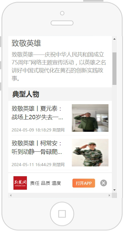 為向歷史開掘精神資源,營造崇尚英雄、學(xué)習(xí)英雄、關(guān)愛英雄的濃厚氛圍,黃石市委網(wǎng)信辦、市退役軍人事務(wù)局聯(lián)合荊楚網(wǎng)(湖北日報(bào)網(wǎng))啟動(dòng)《致敬英雄》大型網(wǎng)絡(luò)專題宣傳。