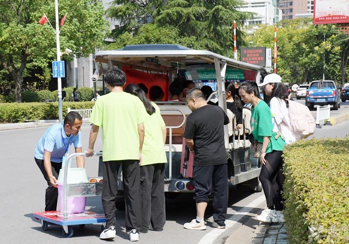 完成報(bào)到手續(xù)后,新學(xué)子們帶上行李,乘坐觀光車直達(dá)宿舍,同時(shí),也開啟了他們的校園探索之旅。記者發(fā)現(xiàn),這些校車觀光車不僅外觀新穎、內(nèi)飾舒適,司機(jī)還饒有興致地為新學(xué)子們詳細(xì)介紹校園的歷史沿革、建筑風(fēng)格、教學(xué)設(shè)施以及各個(gè)學(xué)院的特色。