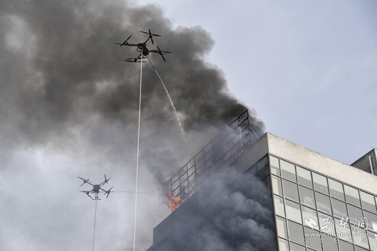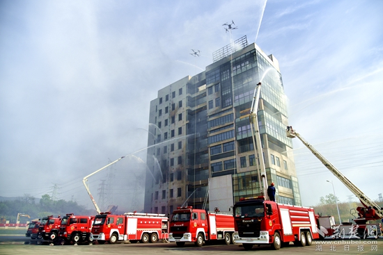 在滅火救援過程中,黃石消防首次設(shè)置無人機(jī)滅火科目,配合云梯車人員疏散、火場緊急避險、高層供水、內(nèi)部攻堅(jiān)等實(shí)戰(zhàn)化內(nèi)容,向參會人員展示了黃石市消防救援隊(duì)伍建設(shè)成效。
