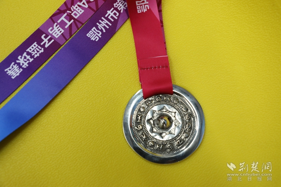 記者在現(xiàn)場看到,已制成的冠軍銅鏡獎牌整體為銀白色,花紋繁復(fù)精美?!跋裎覀兇舜伪荣惇勁扑玫你~鏡叫做日光鏡,也是透光鏡,當(dāng)強光照射在鏡面時,鏡背的花紋會映照在鏡面對面的墻上。”仙有生拿出手電筒現(xiàn)場演示,展現(xiàn)了令人驚奇的一幕——“鄂州市第二屆‘工BA’ 冠軍”的字樣躍然墻上。