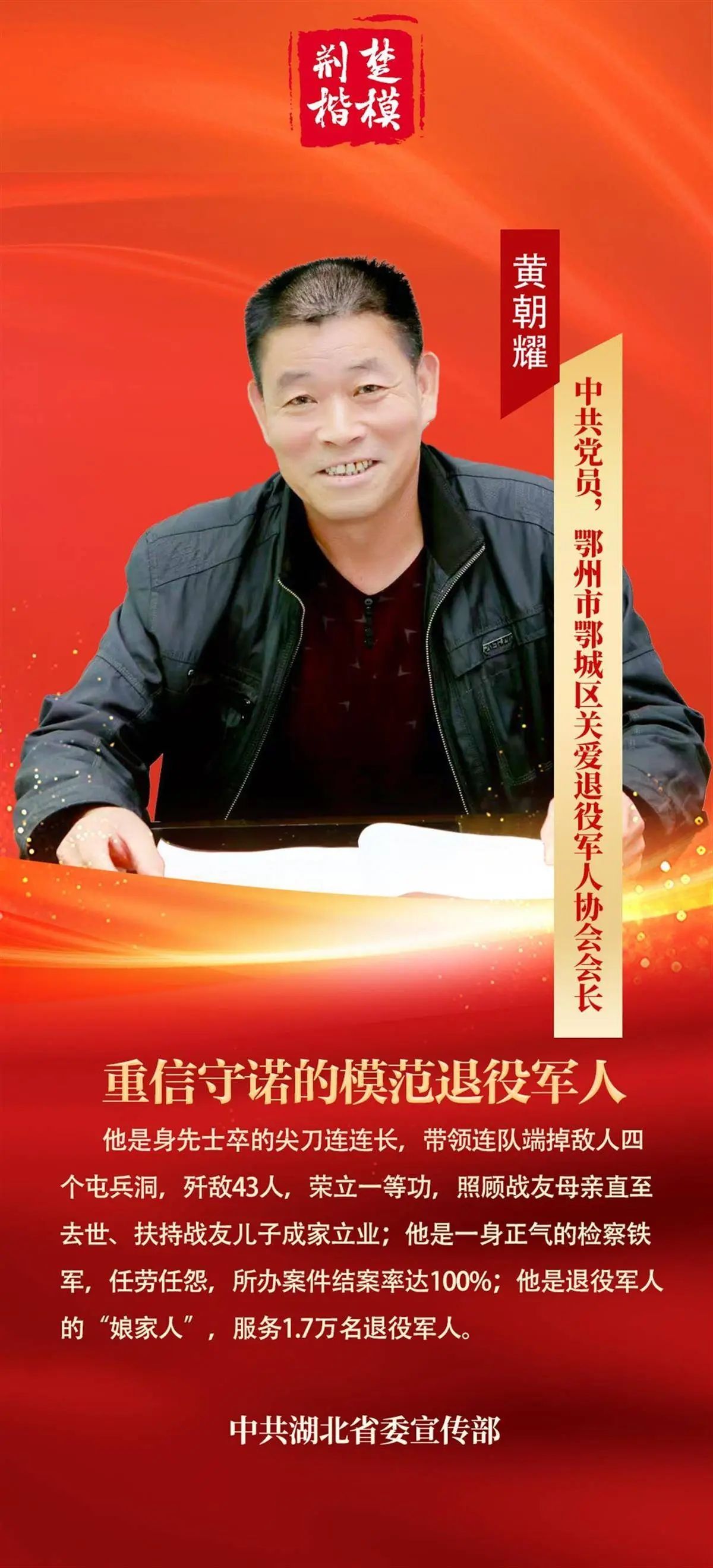 “荊楚楷模”關(guān)于黃朝耀的頒獎(jiǎng)詞為:他是身先士卒的尖刀連連長(zhǎng),帶領(lǐng)連隊(duì)端掉敵人四個(gè)屯兵洞,殲敵43人,榮立一等功,照顧戰(zhàn)友母親直至去世、扶持戰(zhàn)友兒子成家立業(yè);他是一身正氣的檢察鐵軍,任勞任怨,所辦案件結(jié)案率達(dá)100%;他是退役軍人的“娘家人”,服務(wù)1.7萬(wàn)名退役軍人。2024年,他榮獲“全國(guó)模范退役軍人”榮譽(yù)稱號(hào)。
