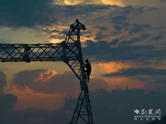 當天下午6點,夕陽染紅了天際。在斜輝映照下,4名電力工人挺立在鐵塔上,準備最后的螺栓緊固工作。