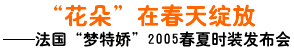 2005年4月5日,源自“時(shí)尚之都”巴黎的經(jīng)典法國時(shí)裝品牌夢(mèng)特嬌,于春天伊始在武漢香格里拉大飯店上演一場(chǎng)激情四溢的時(shí)尚秀。在夢(mèng)特嬌春夏時(shí)裝武漢發(fā)布會(huì)上,設(shè)計(jì)師們將經(jīng)典、動(dòng)感和優(yōu)雅融入夢(mèng)特嬌最新春夏亮絲時(shí)裝系列,將現(xiàn)代經(jīng)典、都市休閑魅力、動(dòng)感動(dòng)力、永恒經(jīng)典和瑰麗高雅五大主題一一呈現(xiàn)。而那最負(fù)盛名的“花朵”標(biāo)志,則仿若今春最絢爛綻放的花朵,在展示臺(tái)上奏出一支“春天的圓舞曲”。
