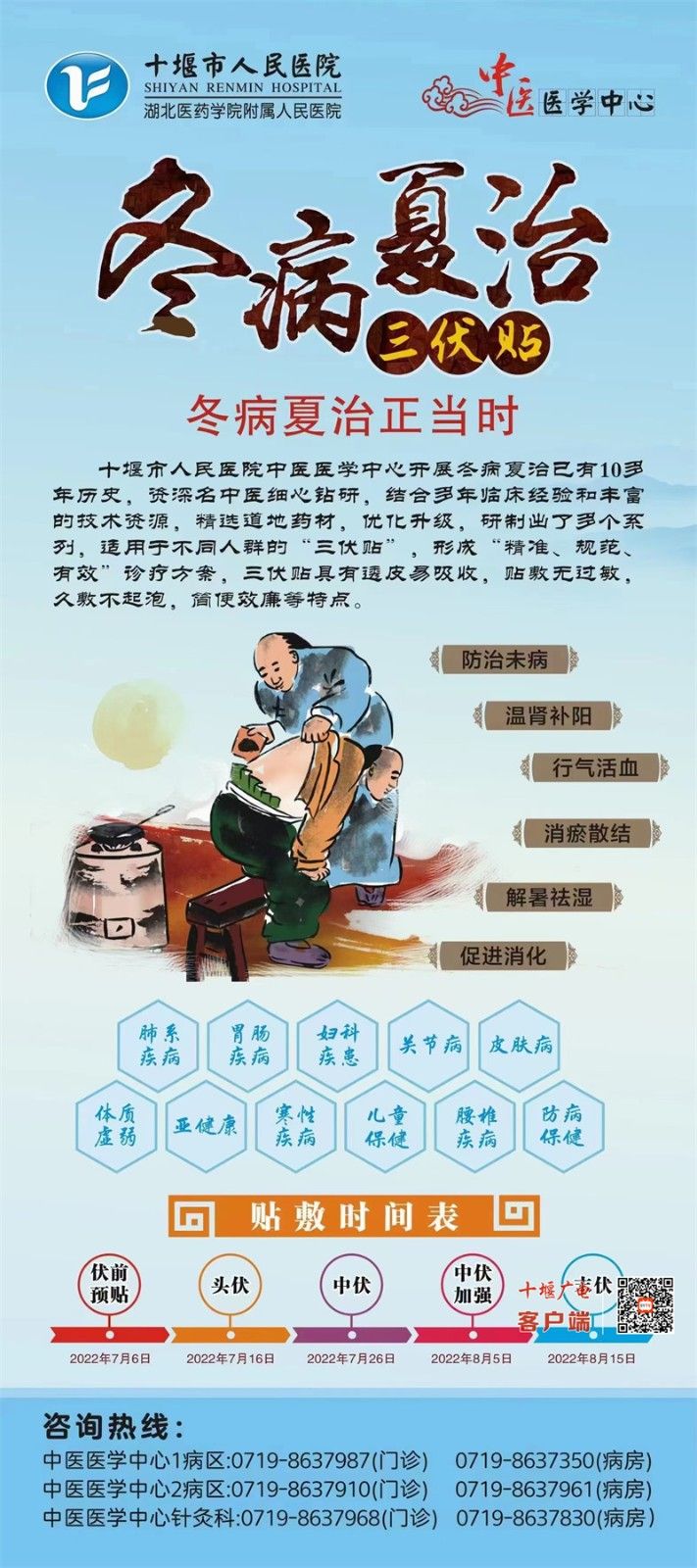十堰廣電訊(全媒體記者 張焱)三伏天是一年中陽(yáng)氣最旺盛的季節(jié),也是“冬病夏治”的黃金時(shí)間,此時(shí)貼敷“三伏貼”能激活人體免疫力,達(dá)到增強(qiáng)機(jī)體抵抗力的作用。今天上午,記者從市人民醫(yī)院中醫(yī)醫(yī)學(xué)中心了解到:中心開(kāi)展的“冬病夏治”三伏貼于今日“火熱”開(kāi)貼。