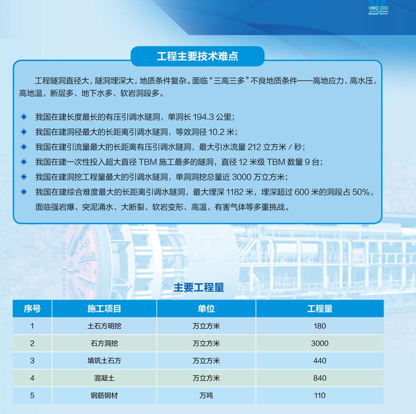 據(jù)介紹,工程輸水總干線采用有壓單洞自流輸水,沿線地質(zhì)條件復(fù)雜,面臨強(qiáng)巖爆、突泥涌水、大斷裂、軟巖變形、高溫、有毒氣體等多重挑戰(zhàn),施工難度極大。工程設(shè)計(jì)與施工將再一次提升我國水利建設(shè)科技能力。