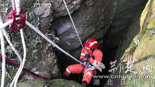 因消防車無法抵達(dá),消防員帶上救援工具,徒步半個(gè)多小時(shí)迅速趕赴事發(fā)現(xiàn)場(chǎng)開展救援。到達(dá)現(xiàn)場(chǎng)后,發(fā)現(xiàn)一名三十多歲男性在一個(gè)10多米的深洞內(nèi)呼救。經(jīng)與被困者和現(xiàn)場(chǎng)群眾溝通了解,此洞名為藏龍洞,是一個(gè)未經(jīng)商業(yè)開發(fā)的深洞,有著悠久的歷史傳說,引來無數(shù)探險(xiǎn)者,這名男子也是因?yàn)楹闷?,下洞后體力不支無法再攀爬出洞被困洞底。中隊(duì)指揮員根據(jù)現(xiàn)場(chǎng)情況,立即利用救援繩索做好安全支點(diǎn),消防員何聰點(diǎn)降至洞底查看被困者情況,所幸洞內(nèi)空氣流暢,被困者無二次受傷的危險(xiǎn),消防員利用隨身攜帶的全身吊帶將被困者固定好后,經(jīng)洞外消防員齊力,最終經(jīng)過20多分鐘的救援,被困人員被成功營(yíng)救出山洞。