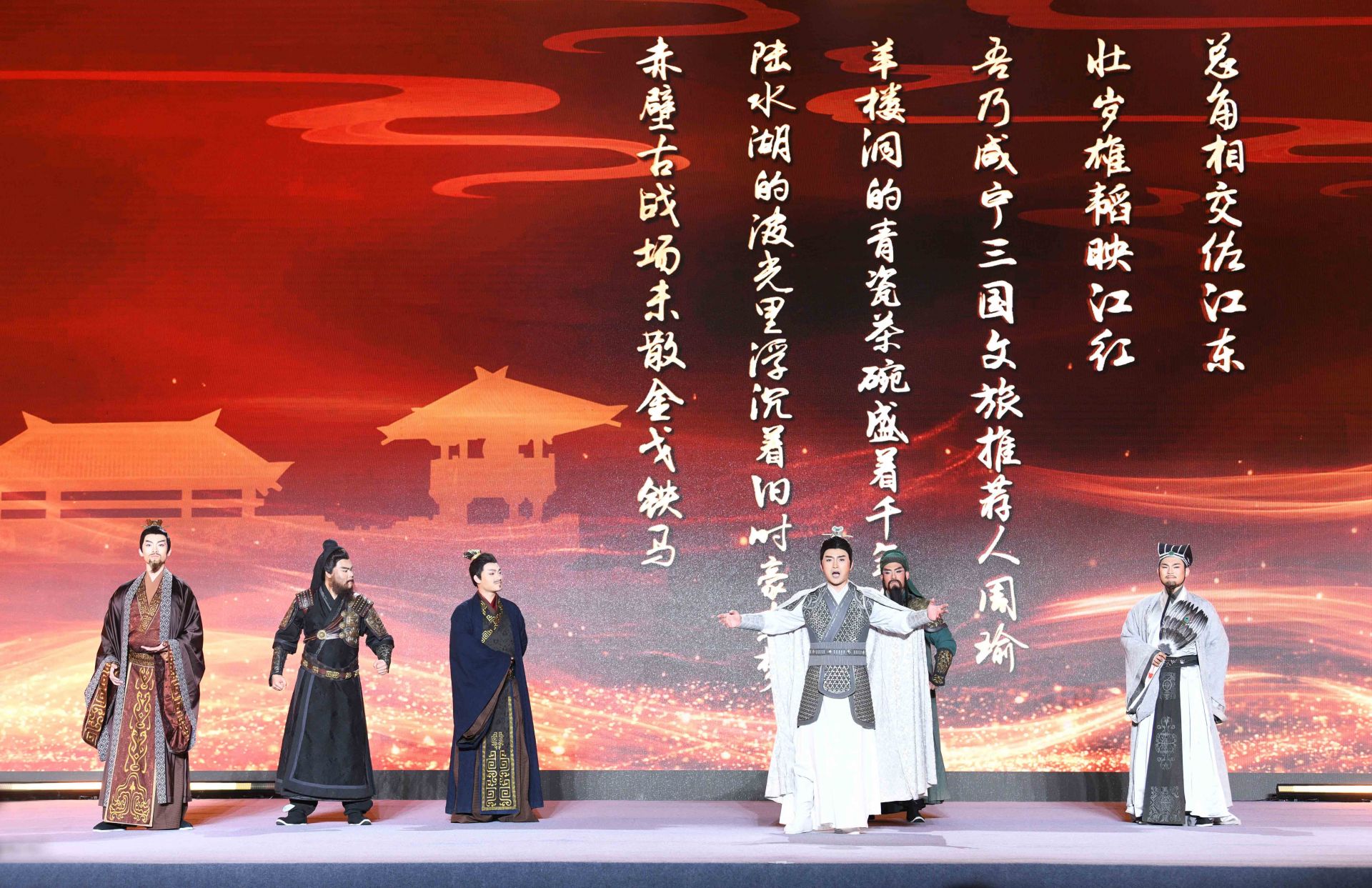 “三國六城,今日結盟!與君共同開啟,荊楚三國文化之旅?!眴邮缴希碇叛b的文旅推薦官,化身三國英雄劉備、關羽、張飛、諸葛亮、孫權、周瑜等,穿越歷史時空,分別代表武漢、荊州、宜昌、襄陽、鄂州、咸寧對外推介各地三國旅游景點和線路。