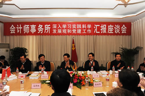 在座談會(huì)上,潘立剛同志分別聽(tīng)取了王文童同志關(guān)于全省會(huì)計(jì)師事務(wù)所開(kāi)展深入學(xué)習(xí)實(shí)踐科學(xué)發(fā)展觀活動(dòng)和注冊(cè)會(huì)計(jì)師行業(yè)黨建工作情況的匯報(bào),武漢市財(cái)政局總會(huì)計(jì)師、市財(cái)政局會(huì)計(jì)師事務(wù)所深入學(xué)習(xí)實(shí)踐科學(xué)發(fā)展觀活動(dòng)指導(dǎo)小組副組長(zhǎng)張灼、襄樊市財(cái)政局副局長(zhǎng)、市財(cái)政局會(huì)計(jì)師事務(wù)所深入學(xué)習(xí)實(shí)踐科學(xué)發(fā)展觀活動(dòng)指導(dǎo)小組副組長(zhǎng)馬琦林、咸寧市財(cái)政局黨組成員、市會(huì)計(jì)師事務(wù)所深入學(xué)習(xí)實(shí)踐科學(xué)發(fā)展觀活動(dòng)指導(dǎo)小組副組長(zhǎng)張麗華以及中勤萬(wàn)信會(huì)計(jì)師事務(wù)所黨支部書(shū)記、董事長(zhǎng)張金才,武漢眾環(huán)會(huì)計(jì)師事務(wù)所董事長(zhǎng)、武漢市注冊(cè)會(huì)計(jì)師行業(yè)黨委副書(shū)記黃光松,咸寧永興會(huì)計(jì)師事務(wù)所所長(zhǎng)、咸安區(qū)政協(xié)委員張麗平等同志先后匯報(bào)發(fā)言。大信會(huì)計(jì)師事務(wù)所湖北分所、中瑞岳華會(huì)計(jì)師事務(wù)所湖北分所、武漢興業(yè)會(huì)計(jì)師事務(wù)所、襄樊華炬會(huì)計(jì)師事務(wù)所黨支部書(shū)記也參加了此次座談。