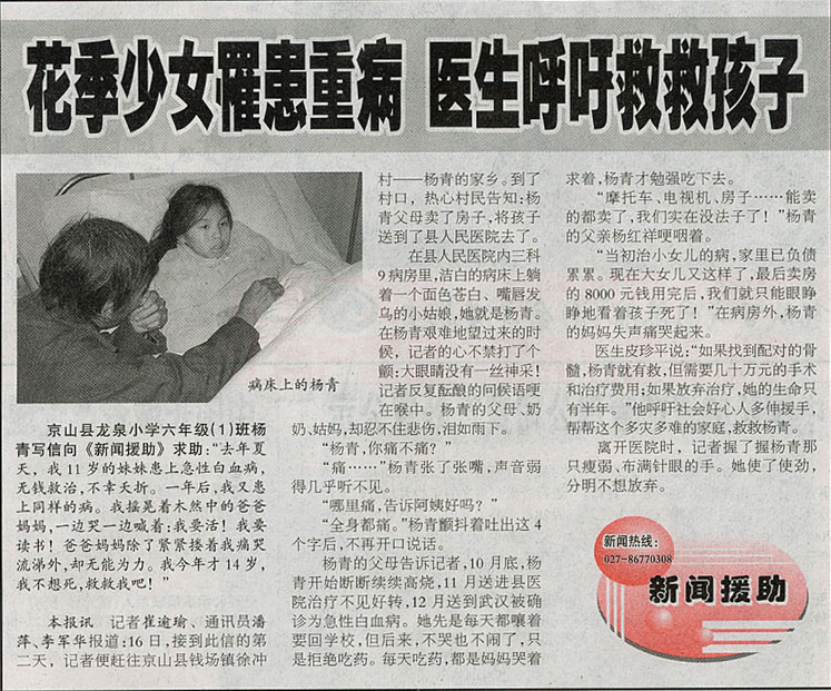 京山縣一對(duì)先后患上急性白血病的少女,妹妹已于一年前不幸夭折,姐姐楊青在死亡線(xiàn)上苦苦掙扎。父母為治療姐妹倆的病,花光了所有積蓄,仍不能湊夠移植骨髓所需的幾十萬(wàn)元手術(shù)和治療費(fèi)用,已經(jīng)陷入絕望。但是,才14歲的楊青不肯向悲慘的命運(yùn)妥協(xié),她寫(xiě)信給報(bào)社:“我不想死,我要讀書(shū),救救我吧!”